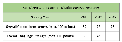 Live Well Schools created the table below to show the San Diego County WellSAT 3.0 score averages by year based on overall comprehensiveness and language strength. As can be observed: